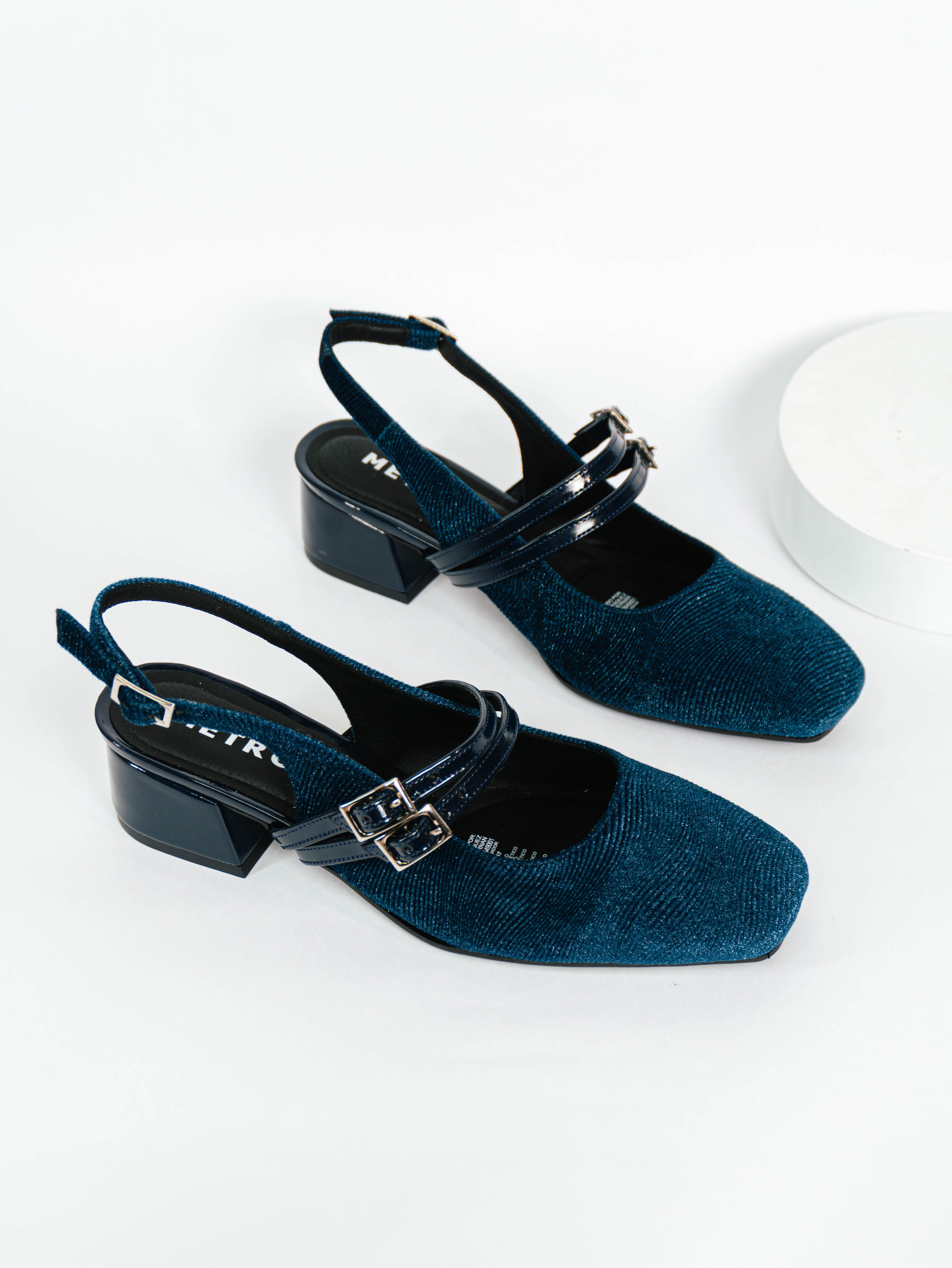 Baleta punta cuadrada azul terciopelo dos correas