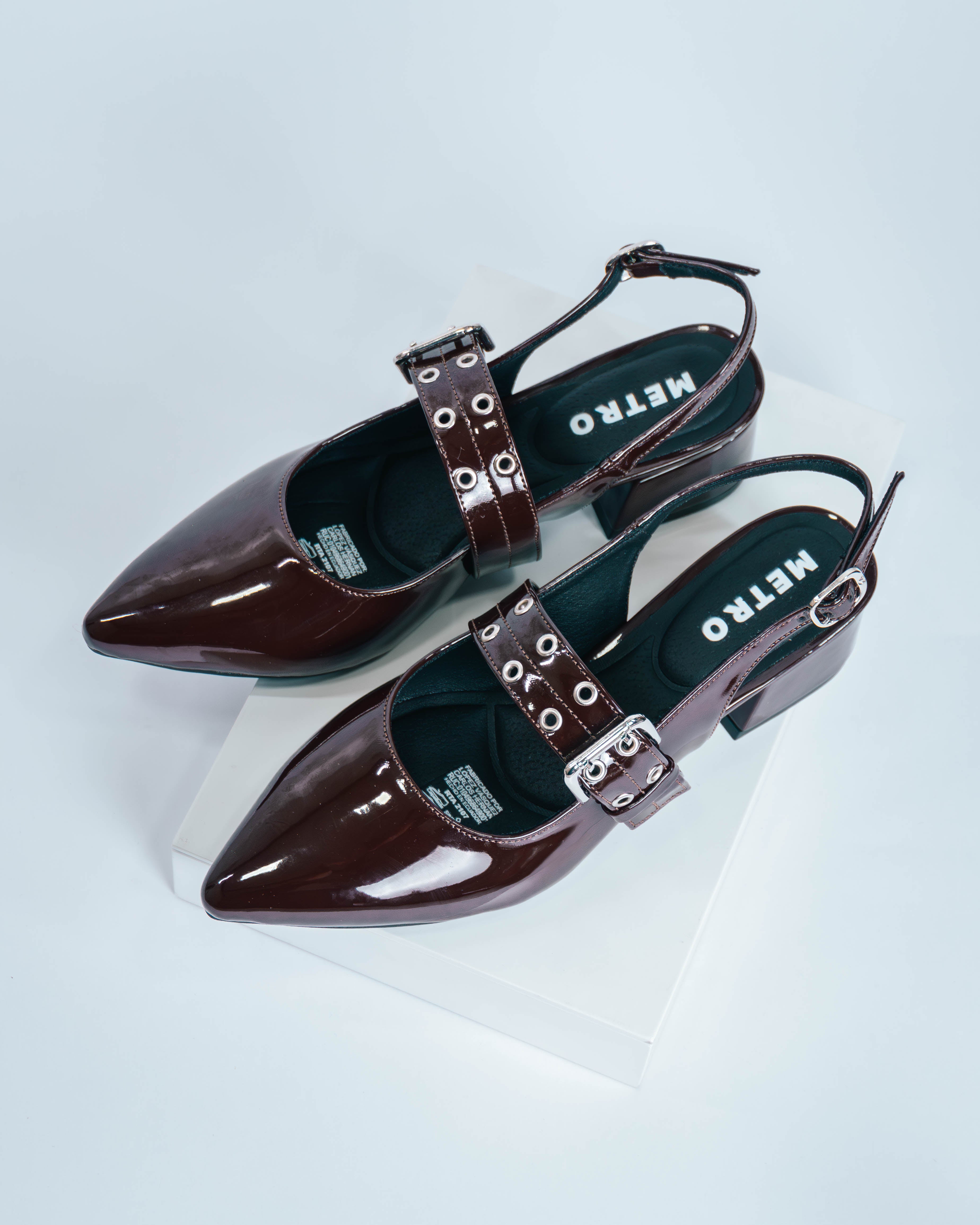 Mary Jane punta fina cafe charol con correa/taches